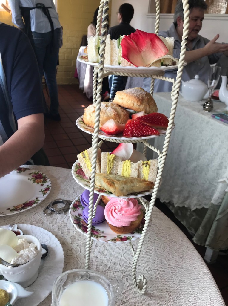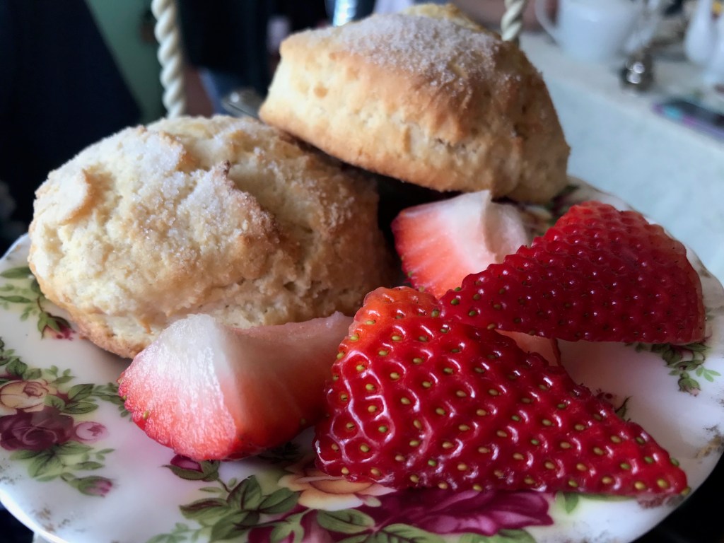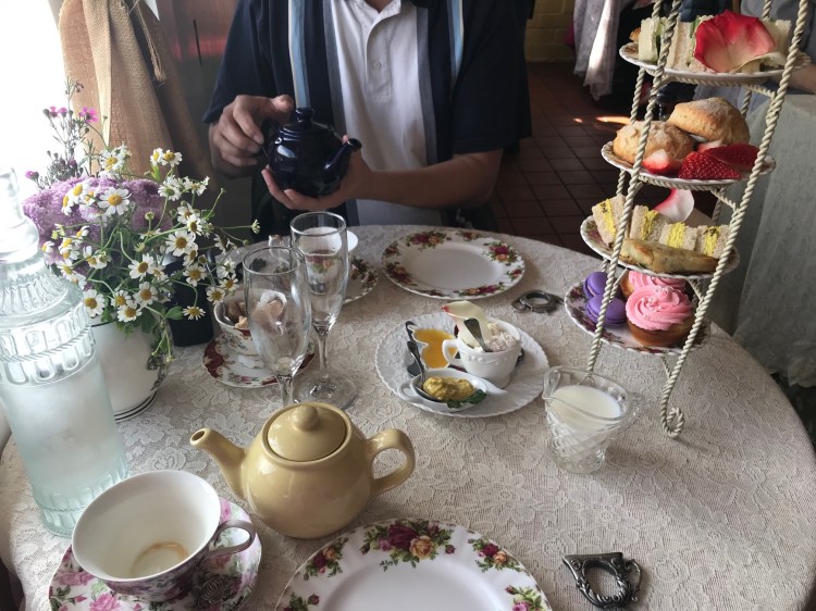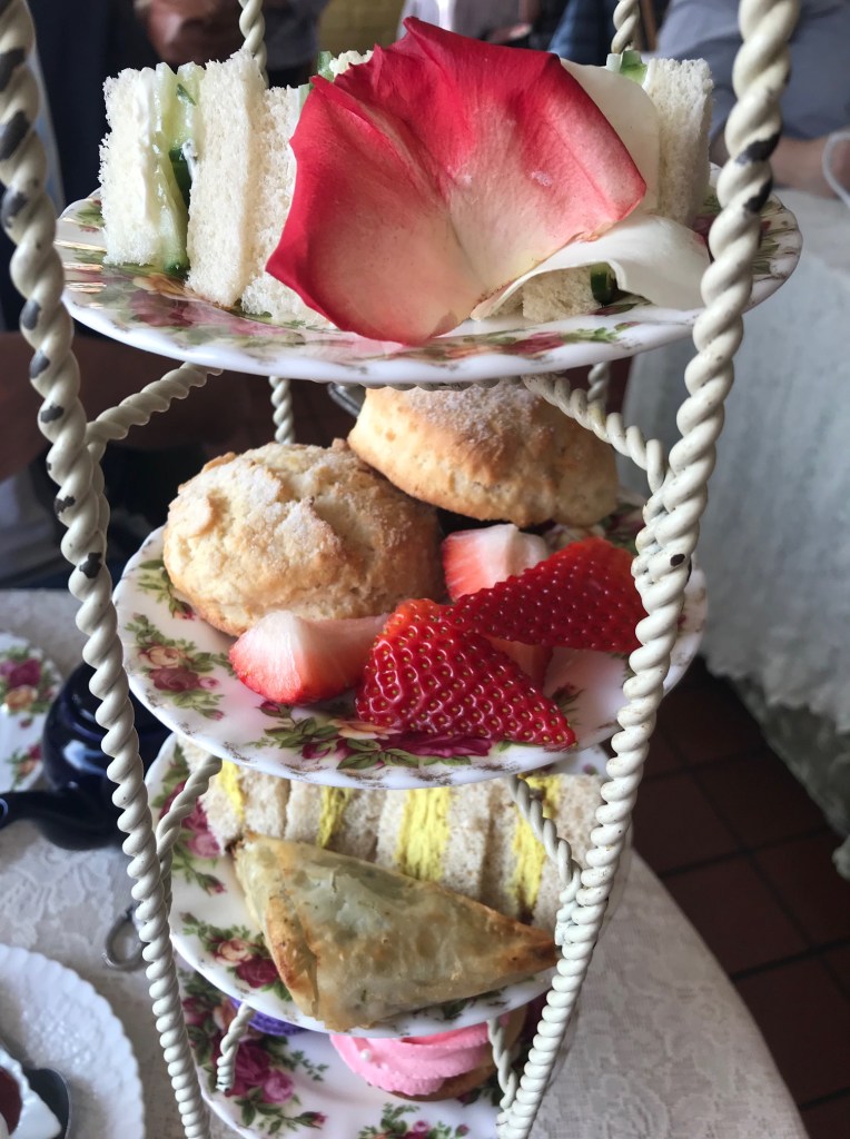 High tea started with flutes of a sparkling cranberry beverage. After the refreshment, I tried a pot of the Archie Royal tea. According to the Eddison & Melrose website, the Archie Royal tea had flavors of cranberry, apricot, oil of bergamot, wild flowers, and berries and John had the 19th of May tea made with malty assam and hints of spice, to commemorate Harry and Meghan’s special day.